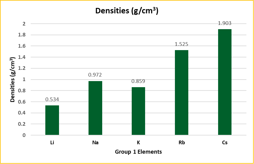 The densities of alkali metals are relatively low due to their large atomic volumes. Interestingly, potassium is lighter than sodium, which is an anomaly due to its larger atomic size.